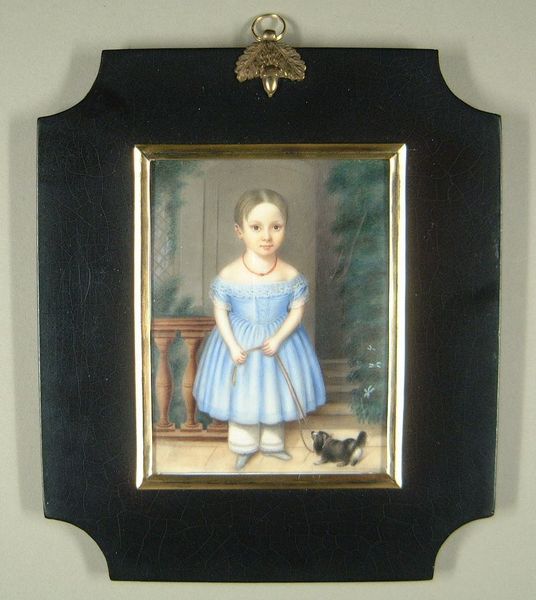 Curator: Here we have what's known as "Portrait of a Young Boy," attributed to Samuel Miller, dating to about 1835. It’s oil on canvas and currently residing here at the Minneapolis Institute of Art. Editor: It's so evocative! There's an undeniable feeling of staged innocence, don't you think? Almost theatrical, with that dark backdrop. Curator: The theatricality you pick up on is interesting, considering it as a constructed display. How the making of it involves choices in fabrics for the clothes, and pigments for rendering those materials. A key aspect here might be the rising economic status the portrait is meant to reflect through meticulous detailing of material goods. Editor: Precisely! And the boy is posed with what appears to be a gold necklace and pendant held to his ear almost like he’s listening for a divine message, all of which strikes me as carefully constructed symbols of wealth, piety and perhaps a yearning for guidance or status. The dog, for instance, traditionally signifies loyalty, fidelity—is it present for a moral suggestion? Curator: Possibly. Look closer at the dog collar— likely a crafted item representing a specific economic value assigned to domestic animals in that era, as opposed to today where perhaps a microchip serves similar identifier purposes. It's also the deep cobalt pigment used in the child’s dress: the processes for mixing and applying these colors represent access to very specific markets and resources. Editor: Yet, the stiffness in the boy's pose...his gaze, directed out at the viewer, but distant. Perhaps indicating the burden placed upon him to represent the family's aspirations. And flowers were the most common item placed into memorial portraiture as symbolic mementos from loved ones. Curator: I can agree on that observation, particularly when analyzing social history by observing which consumer-produced good were important at that specific historical moment. Editor: To step back for a final note: It is just so interesting how, through carefully chosen objects and symbols, the artwork captures both the material reality and psychological landscape of the time, revealing enduring cultural preoccupations with wealth, status, and belonging. Curator: Right! Thank you, by emphasizing labor and commodities involved with early realism, we also come to realize paintings as integral objects to historical economics, beyond art.