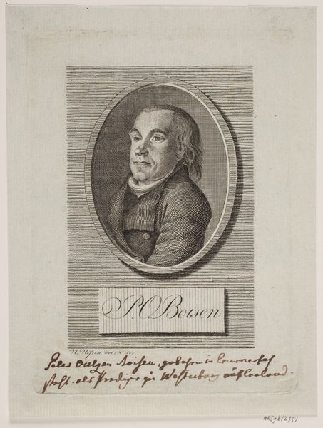 Curator: This is an engraving of Rudolph Buchhave by G. N. Angelo, placing the work somewhere between 1767 and 1816, currently residing at the SMK in Copenhagen. Editor: The figure emerges subtly from the aged paper; there's a real sense of delicate refinement to this Neoclassical print. Curator: Indeed. Neoclassicism was hugely influential then, steering the arts away from the ornamentation of the Rococo style towards classical simplicity, which, politically, meant a return to Enlightenment values and ideals. We see those ideals embedded in the visual representation. Editor: Speaking of production, the fineness of the lines in the engraving speaks to highly skilled labor. It suggests the engraver's mastery of the tools, like the burin, and also a very controlled application of pressure to achieve such subtlety. Was the printmaking industry established, or were individual engravers producing these works? Curator: Angelo was part of a growing network of artisans producing imagery that helped to codify social status and create visual records of the era. Portraiture of notable figures like Buchhave, a physician, suggests how society valued his contributions. Printmaking allowed for wider circulation. Think about how images shaped public perceptions. Editor: The materiality is important; it is print which is itself made for dissemination and exchange. And it appears age-toned—that's fascinating, adding texture and authenticity! It makes me wonder how many impressions were made, and to what social circles this image would have been circulated. Curator: The decision to portray him in profile, within an oval frame, lends itself to classical precedents, like Roman portrait busts. His powdered wig, tailored coat—it's a careful construction of identity. The engraver also made particular choices to project notions of prestige onto this likeness. Editor: This work prompts questions about labor, visibility, and the relationship between an individual and the means of replicating their image within a community. Curator: A valuable glimpse into the machinery of image production and cultural transmission within 18th-century society, wouldn't you say? Editor: Precisely! The layering of process and person, really gets you thinking.