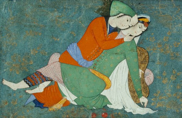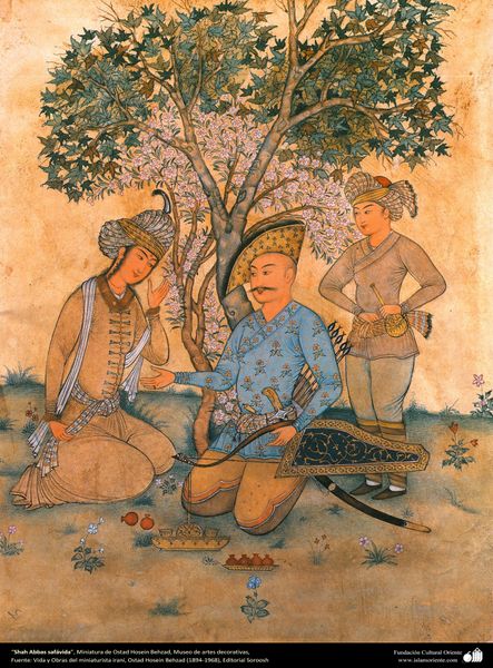Hossein Behzad created this painting, "If you proclaim the beauty then you're right," sometime before 1968. This composition strikes you first through its intricate detail and flat perspective. The eye moves from the floral patterns of the man's robe to the delicate blossoms on the trees. The woman’s elegant stance draws us into the scene's narrative. Behzad's technique employs a structural flattening, typical of Persian miniature painting, which defies Western conventions of depth and perspective, emphasizing surface and pattern over illusionism. The meticulous rendering of details invites a semiotic reading, where each element, from the clothing to the landscape, functions as a sign contributing to the overall meaning. Consider the placement of the figures: their positioning within the landscape and their gestures. This isn't just a depiction of figures in a landscape; it’s a constructed space where symbolic elements converge to prompt questions about beauty, representation and the very nature of perception itself.