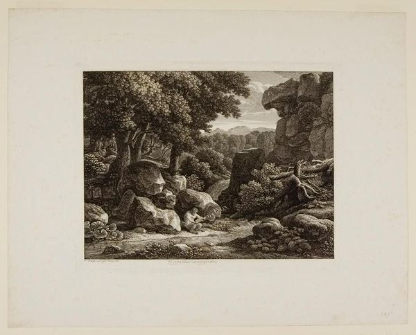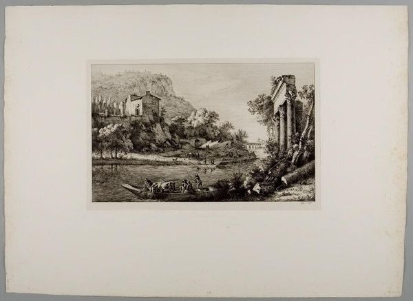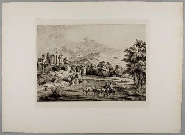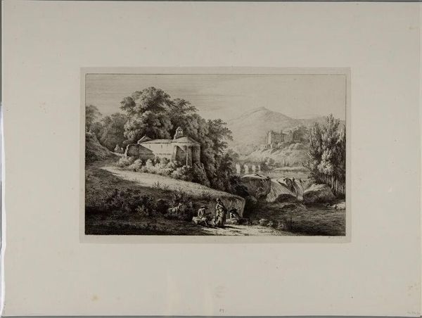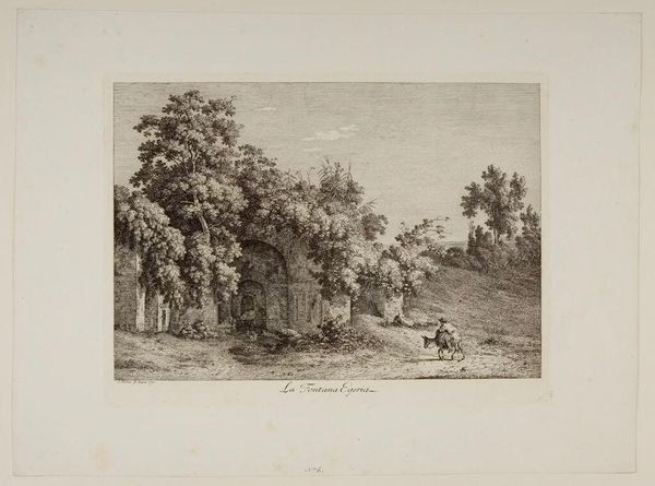 Curator: This is "Herdsman Playing a Flageolet to a Shepherdess" by Jean Jacques de Boissieu. Editor: It evokes a feeling of tranquil isolation. The intricate etching creates a miniature world, almost dreamlike. Curator: Boissieu, active in the 18th century, excelled in capturing pastoral scenes. The strategic placement of light draws the eye. Observe how the dark foliage contrasts with the open sky. Editor: Indeed, and it’s worth mentioning the historical context; such idealized depictions reflected a yearning for simpler, rural life amidst growing urbanization and social change. The image perpetuates idealized views of peasant life that may not reflect reality. Curator: I agree, although, viewed formally, the composition is remarkably balanced. Note the placement of the figures in relation to the architecture; it guides the eye through the landscape. Editor: The popularity of such images also relates to the rise of the bourgeoisie. They were the ones buying them, projecting their ideas on the underclass. Curator: An insightful point. This interplay between form and context enriches our understanding, doesn’t it? Editor: Absolutely, it makes one think of the politics of nostalgia.