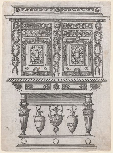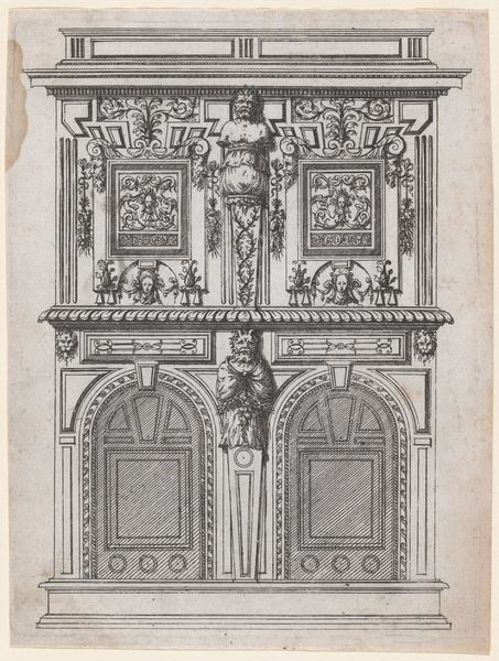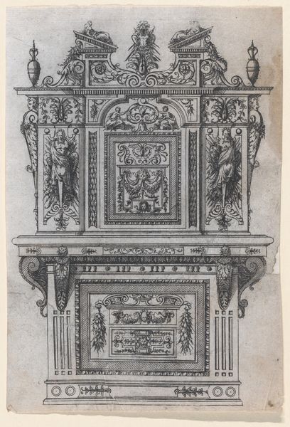 Jacques Androuet Du Cerceau created this design for furniture in ink on paper in the mid-16th century. This drawing provides a fascinating glimpse into the social and cultural values of Renaissance France. The elaborate ornamentation, classical motifs, and allegorical figures reflect a society that prized elegance, learning, and the grandeur of the past. The image creates meaning through visual codes of classical architecture, suggesting the patron was cultured. Consider the influence of the French court and its patronage of the arts, as well as the role of furniture in conveying status and wealth. We see the design of the furniture itself with pillars, mythological scenes, and classical figures to show not only wealth but also the 'good taste' of the furniture's owner. Historians look to sources, such as period documents and comparative analyses of surviving furniture, to understand the design. This helps to reconstruct the values and beliefs of the people who commissioned and used these objects.