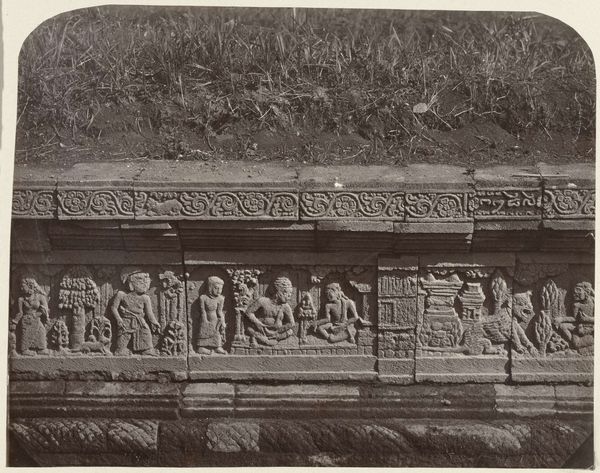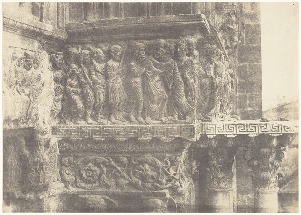 Editor: This is Charles Nègre's photograph of the "Bas-relief aan de kerk van Saint-Gilles-du-Gard," taken in 1852. The muted tones give it an almost dreamlike quality, blurring the lines between photography and sculpture. I’m particularly struck by the serenity in the figures’ faces. What are your initial thoughts? Curator: Well, immediately, I feel the weight of history, almost like dust motes dancing in sunbeams. Nègre's photo, in its ghostly way, bridges us to the ancient. Notice how the rigid formality of the relief is softened by the photographic medium itself? The very choice feels…deliberate. I can almost hear the echoes of chants and see processions snaking around that very church. Editor: It’s like he’s not just documenting the sculpture, but somehow trying to capture its essence across time. Did Nègre often work with religious themes? Curator: Not exclusively, but he had an undeniable fascination with capturing the grand narratives etched in stone, wood, or spirit across France. It feels like he was wrestling with the monumental... trying to make it portable, digestible. He takes a slice of eternity. What strikes you most about the figures themselves? Editor: Their stillness. They're frozen in this perpetual solemnity. Almost makes you wonder what stories they'd tell if they could. I never really considered photography a tool for interpreting ancient sculpture this way, until now. Curator: Precisely! It is as though photography is holding a mirror to time itself. Suddenly, Nègre’s capturing more than just a stone carving, doesn’t he? He’s coaxing us to meditate on time, memory, and faith itself. It is almost magical when you think about it. Editor: I agree! I’m definitely seeing this photograph in a new light, so to speak!