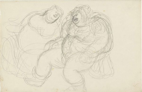 Henk Henriët made this drawing of embracing giants and a small figure with pencil on paper. The lines are light, layered, like a palimpsest of intentions and revisions; a process of searching for the right form that feels very contemporary. The soft, graphite strokes build up the volumes of these monumental figures in a way that feels both tentative and confident. I am drawn to the contrast between the solid, grounded forms of the giants and the tiny, almost ethereal figure standing alone below. The texture of the paper is also important, it gives the drawing a sense of immediacy. Look at how the artist has used the side of the pencil to create shading. This is particularly visible around the figure on the left side. The overlapping lines around the heads of the figures make the image vibrate, and shows us that Henriët was unafraid to let us see the workings behind the image. It reminds me of the work of Paula Rego, in that the artist is interested in exploring the psychological relationships between people and power. Like Rego, Henriët uses scale and distortion to create a sense of unease and ambiguity, reminding us that art embraces multiple interpretations.