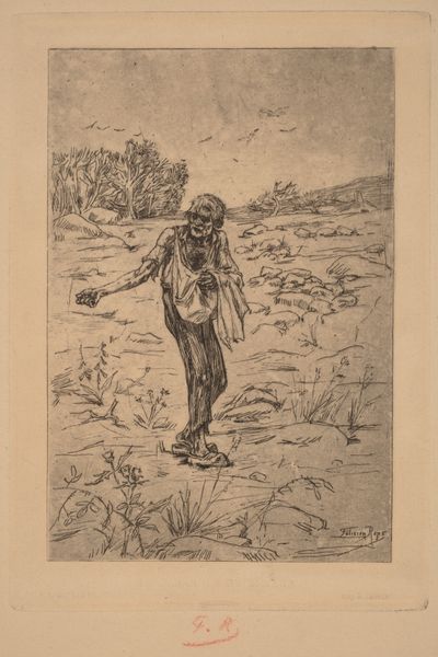 This etching of a farmer with firewood was created by Johannes Wilhelm Zillen, and it now resides at the SMK. The composition is dominated by the stooped figure of the farmer. Zillen's use of fine, closely spaced lines creates a sense of depth and texture, particularly in the depiction of the rough terrain and the farmer's heavily laden back. The stark contrast between the etched lines and the blank paper serves to highlight the figure's struggle against the elements. The etching's formal qualities, like line and contrast, evoke the harsh realities of rural life. It's a narrative not just of labor but of a deeper relationship with the land. We're invited to contemplate how these etched lines capture not merely an image, but a commentary on existence. The farmer's form and the land he walks on become signs which connect the material conditions of life with the artist’s commentary on resilience and the human spirit.