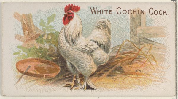 This is an image of a Dark Brahma Cockerel, part of the Prize and Game Chickens series made for Allen & Ginter Cigarettes. The composition is immediately striking, dominated by the robust figure of the cockerel. Notice how the artist uses contrasting colors, setting the dark plumage against the softer, diffused background. The texture is suggested through a delicate use of line and stippling, creating a sense of depth within the compact space. It’s fascinating how such a small image encapsulates larger ideas about value and representation. As a trade card, the image functions within a semiotic system that assigns value not just to the depicted object—the prize-winning chicken—but also to the cultural codes it represents. The very act of categorizing and displaying these breeds speaks to the emerging scientific and social structures of the time. Consider the aesthetic choices here. The image captures attention through its careful construction. It invites ongoing interpretation and reflects the values of its time.