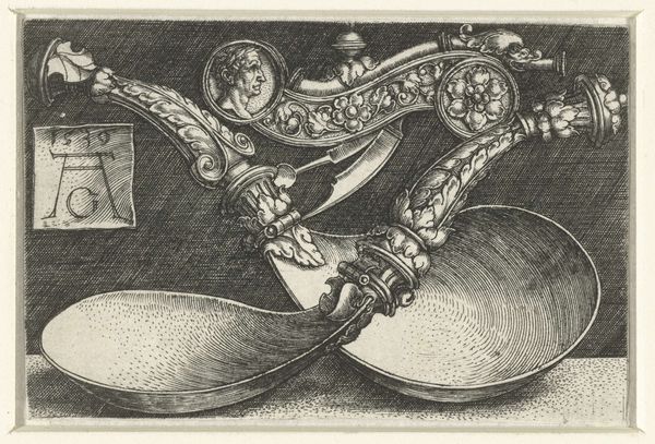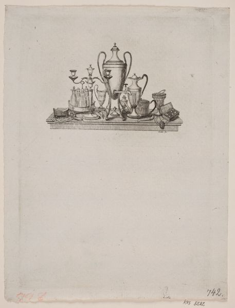 Curator: Let’s consider Jacob Gole’s “Still Life with Bowls and Pitchers," likely created between 1670 and 1724, housed here at the Rijksmuseum. The Baroque engraving features various metallic vessels alongside organic elements in a composition of rich contrasts. Editor: My first thought? It’s a meticulously organized bounty. It evokes this sense of Dutch opulence, yet it's rendered in stark greyscale. A very austere luxury. Curator: Indeed. The composition adheres to a strong horizontal and vertical structuring, noticeable in the layering of the objects. The reflective quality of the silver elements creates a play of light, guiding the viewer’s eye through the organized chaos of its composition. Editor: Chaos is spot on, actually. See that tipped plate with food slipping off? I love how Gole introduces that subtle disruption, preventing the whole thing from becoming too stiff. It whispers of life, of an interrupted feast maybe, a moment captured mid-celebration. Curator: Disruptions can highlight the Baroque tension between ornamentation and reality, the earthly and aspirational. Consider how each object reflects, and refracts, light onto the others, and notice that the contrast creates varied forms and volumes. This careful articulation transforms base metals into more ethereal form. Editor: And what is it about Dutch still lifes, huh? They always remind me of Vanitas, of course – a meditation on fleeting beauty and impending doom. Is that silver pitcher half full, or half empty, Gole is asking. Will those grapes go bad tomorrow? And what does it mean that the pewter plates will remain untouched after our life ceases? Morbid, but… delicious. Curator: Quite right. The tension in the piece reveals that the visual vocabulary provides a window into understanding complex reflections on materialism, fleeting beauty, and inevitable decay. Gole successfully composes it using light and structure, offering a visually engaging example of symbolic density. Editor: Agreed. Gole pulls off an amazing balance. A sumptuous memento mori, crafted with razor-sharp precision! Curator: It's a dense work—visually compelling and rich in the vocabulary of vanitas, all articulated through its careful structural relationships.