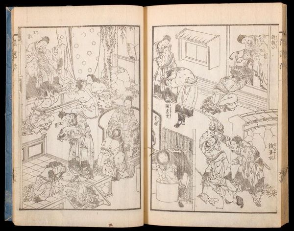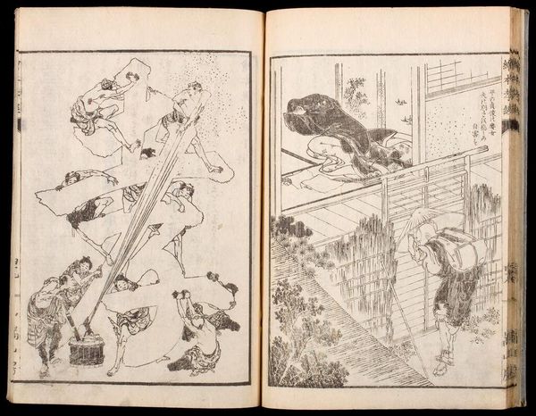 Curator: This artwork is volume two from *GyÅsai's Discourses on Painting*, by Kawanabe Kyōsai. Editor: The energy in this ink drawing is immediate—almost chaotic. So many figures, each seemingly in motion. Curator: Kyōsai was known for his ability to blend traditional Japanese painting with Western influences and a distinctive sense of humor. Look at the cultural symbolism here! Editor: I'm struck by the implied critique of societal hierarchies, monks above, commoners below. The artist depicts a complex interplay of power and tradition. Curator: There's a psychological intensity here too, a deep emotional connection with the world. Editor: These images provide a glimpse into the social structures, the cultural dynamics, and perhaps even the political tensions of his time. Curator: It gives us so much to consider about memory. Editor: Indeed, and about how art serves as both a mirror and a commentary on our shared human experience.