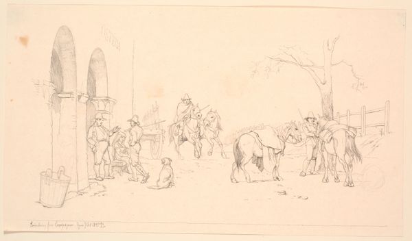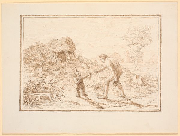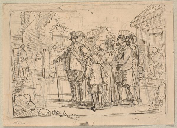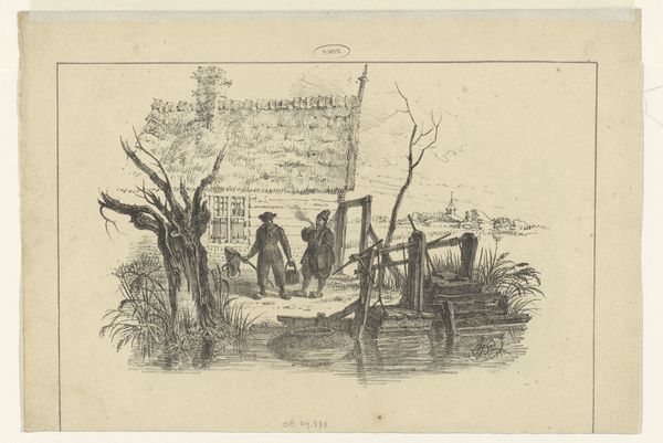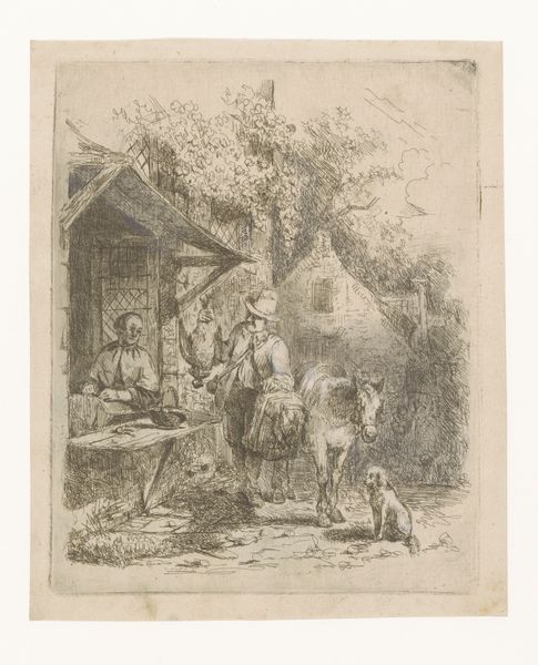 Curator: Looking at Christen Dalsgaard's etching from 1824-1907, "Grædende bondefamilie (illustration til eventyret "Bjergmanden og Tordenvejret")", its melancholic mood immediately strikes me. It's like a faded photograph, capturing a scene that feels both distant and intimately human. Editor: Yes, there's a definite somber tone. I'm immediately drawn to the delicate lines and the almost dreamlike quality of the scene. There's something inherently vulnerable about these figures etched so delicately onto the page. It feels as if I'm witnessing a fragile moment in their lives, almost intrusive. Curator: The piece serves as an illustration for the fairy tale "The Mountain Man and the Thunderstorm". The etching portrays a peasant family outside their home, perhaps dealing with hardship, although what’s actually causing their distress is vague within the frame itself. This lends itself to wider ideas around representations of peasant life, their connection to nature, and ideas of collective vulnerability. Editor: It makes me think about how artists often depict rural life—there is a romantic tendency to either over-simplify the harshness of everyday struggle, or sensationalise it in overly dramatic ways. Does Dalsgaard fall into that trope? It does hint to a larger socio-economic narrative with a family struck by circumstance. Curator: To unpack that, we could consider genre painting conventions in Romanticism; these frequently highlighted sentimental and moralising aspects. Given the tale it illustrates, one angle here may be the relationship between humanity and the natural world—especially pertinent in early 19th-century Romanticism with the rise of industrialization impacting rural populations. The etching captures the social anxieties linked to changing environments and economic strains for peasant classes, something we could unpack with a look at the rise of social realism as a genre. Editor: Ah, I get that, viewing it more broadly beyond the direct visual narrative! For me, what lingers most are the understated emotions and the intricate rendering. Curator: Precisely. I appreciate that it moves beyond sentimental genre scenes, suggesting larger socio-economic anxieties through careful symbolic renderings, something quite incisive in Danish art historical context. Editor: Agreed. It's a subtle but affecting illustration, reminding us of the intersection between folklore, representation, and history. I find myself seeing the sadness in the work resonating still today with modern climate refugees or disaffected rural communities struggling with post-industrial society, which offers a broader contemporary reflection.