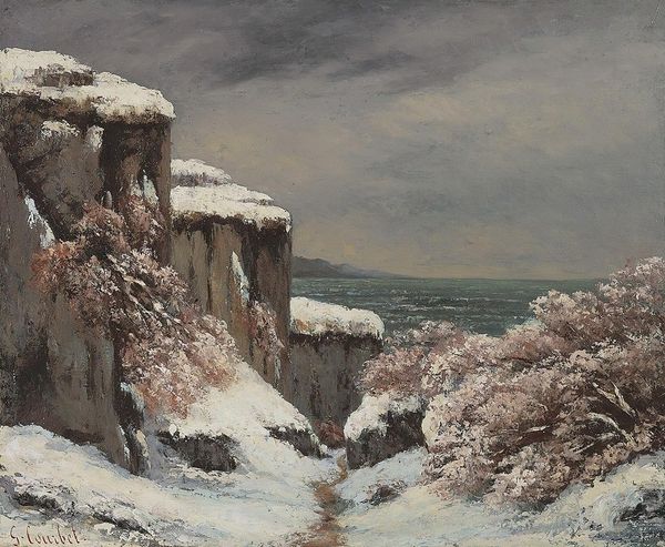 Editor: Here we have Courbet’s “Effet De Neige,” or “Snow Effect,” rendered in oil paint. It's incredibly tactile; you can almost feel the chill of the winter landscape. What strikes you about its visual composition? Curator: The painting's structural integrity resides primarily in its arrangement of contrasting textures and tonal values. Observe how the rough impasto of the snow-laden branches juxtaposes with the smoother, more fluid rendering of the sky. What is communicated is an interesting balance, almost a tension. The heavy browns are also an integral aspect. Editor: I hadn't considered the importance of those contrasts so directly. Does this play into any known theories of Realism at the time? Curator: Think of Courbet's approach as a material response. Realism wasn't just about depicting subject matter accurately; it was equally about using the materiality of paint to evoke a sensory experience. Consider the thick application—the painting becomes an object in itself, echoing the tangible reality of the scene. Is Courbet simply representing a winter landscape, or is he building it anew for us? Editor: Building it anew—I like that idea. The materiality is definitely forefront here, now that I consider the visible brushstrokes. The whole image has so much volume. Curator: Volume, yes. Look, too, at how he articulates space not through linear perspective, but through the layering of these textural planes. The foreground is quite heavy, the background ethereal. Editor: This gives me so much more to look for in future Realist and Impressionist landscapes, thinking about not just subject, but form. Curator: Precisely. Attending to form unveils the mechanics of meaning.