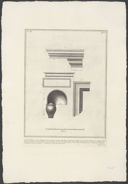This engraving by Giovanni Battista Piranesi details the ornamentation of ancient Roman burial chambers using ink on paper. The stark monochrome rendering gives prominence to the geometric precision of the architectural elements, evoking a sense of classical austerity and meticulous documentation. The composition emphasizes a structural interplay between linear forms and spatial depth. Piranesi presents these antiquities not merely as relics, but as constructed signs laden with cultural meaning. Consider, for example, how the careful rendering of moldings and niches functions as a semiotic code, communicating the values of order, permanence, and commemoration that were central to Roman society. The arrangement on the page mirrors the archaeological method of isolating and classifying objects, thus imposing a modern system of knowledge onto the fragmented remains of the past. The use of scale—note the inclusion of a ‘Palmi’ scale— highlights a tension between objective measurement and subjective interpretation. This functions within the broader discourse of archaeology and the Enlightenment's pursuit of knowledge through empirical observation, while simultaneously acknowledging the constructed nature of historical narratives.