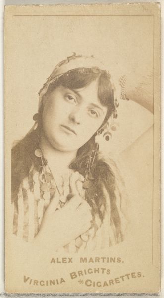 This is a promotional card made by Allen & Ginter for Virginia Brights Cigarettes, it features actress Camille White. These cards, popular in the late 19th century in the United States, offer a glimpse into the intertwined worlds of commerce, entertainment, and social values. The card's visual codes speak to the cultural references of the time. The choice of an actress suggests the rising status of performing arts and the cult of celebrity. Camille White's demure pose, complete with lace bonnet, is a study in idealized femininity, projecting an image of purity and grace that resonates with Victorian sensibilities. Such images reflect the conservative social structures of their time, reinforcing gender roles and aesthetic ideals. The card also indirectly critiques the institutions of art by commodifying art into a small commercial item. Understanding this image requires research into the history of advertising, theater, and gender in the late 19th century United States. In doing so, we reveal the contingent nature of art, ever shaped by social and institutional contexts.