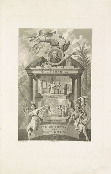 Editor: We're looking at a print from 1888, a "Diploma behorende bij de gedenkpenning bij het vijftigjarig bestaan van Natura Artis Magistra," which, judging from the style, is an engraving. It depicts a monument-like structure with classical figures. The figures to the sides and front seem very realistically rendered in contrast to the stylized monument. What's your read on a piece like this, historically? Curator: It’s fascinating how this print intertwines the visual language of civic pride with the rising prestige of scientific institutions. “Natura Artis Magistra,” that is the Amsterdam Zoo. Its 50th anniversary wasn't just a celebration of an institution, but also a public demonstration of faith in science and the power of classifying and understanding the natural world. Editor: I see that; it almost seems to be deifying the zoo itself! What is up with those classically styled figures? Curator: Precisely! Note the allegorical figures on top, reminiscent of classical depictions of wisdom and nature, but they are there placed on a plinth that serves as the institutional record itself! Who do you think this kind of commemorative engraving spoke to at the time, and what function might it have served? Editor: Well, probably the shareholders, or board members. It feels like propaganda for the zoo—like today’s version would be an instagrammable moment to drive up visitorship! It's kind of incredible to consider how institutions build legitimacy through imagery, even back then. Curator: Absolutely. And seeing this “instagrammable moment” as a modern counterpart really clarifies how public image and institutional prestige were carefully crafted, then and now. An occasion like this served not only to celebrate history, but to galvanize financial and social support for the institution going forward. Editor: I guess art really does reflect the values we hold as a society, even in what looks like just a certificate. Thanks for shedding some light on it!