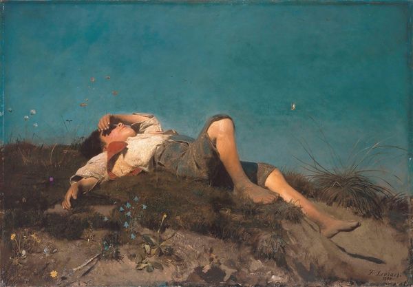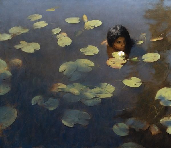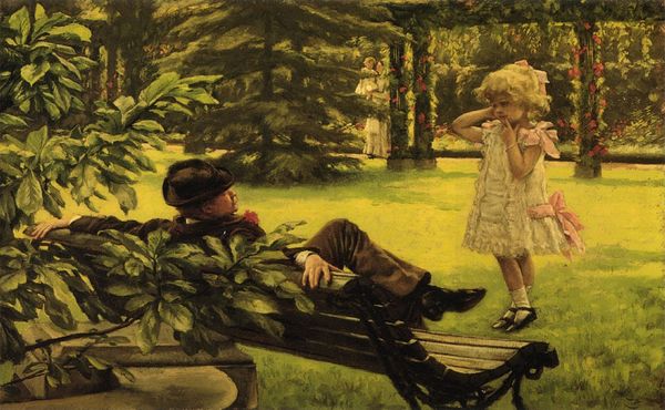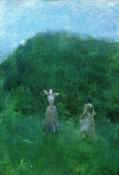 Curator: This is Heinrich Kuhn’s "Miss Mary and Edeltrude Lying in the Grass," circa 1910. The photograph, an exquisite example of pictorialism, captures two figures nestled in a sun-drenched meadow. Editor: It has this hazy, dreamy quality, like a half-remembered summer afternoon. All that muted light—it almost feels like a painting rather than a photograph. Is it meant to feel sentimental? Curator: Pictorialism, indeed, sought to elevate photography to the level of fine art. Consider the composition: Kuhn manipulates light and shadow to create a soft, diffused effect, emphasizing atmosphere over sharp detail. The strategic blur invites subjective interpretation. Editor: And those large hats! They create these wonderful pools of shadow, obscuring the faces and lending a sense of mystery. Are they hiding? Or just lost in thought? They somehow become objects as much as the figures they protect. Curator: Precisely. Note the tonal range – Kuhn skillfully uses a limited palette, primarily greens and muted yellows, to evoke a serene and harmonious mood. There's a deliberate flattening of perspective, characteristic of the movement, to further abstract the scene. Editor: I'm curious about the choice of the ordinary subject matter itself. Kids in a field? But perhaps its exactly this seeming spontaneity which becomes its strength; so naturalistic it is abstract. And even with these details missing from their faces, one reads it emotionally quite strongly. Curator: Kuhn was interested in photography’s power to capture not just surface appearances, but also subjective experience and, dare I say, emotional depth. This intimate tableau underscores pictorialism's rejection of straightforward representation. Editor: The effect, I think, transcends pure aesthetic exercise. "Miss Mary and Edeltrude Lying in the Grass," more than anything, manages to conjure for us that very specific melancholic feeling. Thank you, both Kuhn, and this image. Curator: Indeed, a contemplative lens onto photography, childhood and pictorialist values. A truly innovative convergence, captured in stillness.