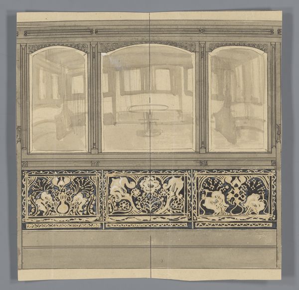 Curator: This drawing, made circa 1874-1945, is entitled "Ontwerp voor decoratief glaspaneel met floraal ornament", or Design for a Decorative Glass Panel with Floral Ornament, by Carel Adolph Lion Cachet. It’s a mixed-media work on paper currently housed in the Rijksmuseum collection. Editor: My first impression? It feels incredibly intricate and almost soothing, like looking at a carefully planned garden rendered in delicate pencil strokes. There’s an appealing, symmetrical order that seems to define the composition. Curator: Cachet was a significant figure in the Dutch decorative arts scene, and this design illustrates his engagement with the Art Nouveau movement. The museum context in which these drawings were originally archived tells us a lot about art education at the time. Editor: Definitely, and thinking about the societal context, one could analyze how the embrace of floral motifs in Art Nouveau reflects changing attitudes toward nature and industry during the late 19th and early 20th centuries. It might even signal the budding of a conscious response to rampant industrialization. Curator: Indeed. Look closer, and you will see that Cachet’s approach reflects a period where design began being considered holistically, with architectural drawings being carefully linked to broader societal aesthetics. This glass panel's role transcends pure functionality. Editor: Right, because considering it within a feminist theoretical framework, how might the design relate to historical constructions of femininity associated with the natural world? Or what possibilities emerge by centering these architectural designs as forms of gendered labor? Curator: I appreciate that. Examining Cachet’s broader portfolio—tapestries, furniture designs, and graphic work—gives context to the layered pattern in this architectural design. Cachet aimed to unify all aspects of the interior environment. Editor: Precisely. Seeing that the ornamental structures were often displayed at industrial expositions to advocate the benefits of mass productions to the wider public adds an additional layer of context to Cachet's goals. Curator: Seeing Cachet’s artistry, both social awareness and meticulous dedication become all the more evident. Editor: Indeed, viewing his work today, it is clear how his blend of art, design, and commentary continue to spark valuable dialogues.
