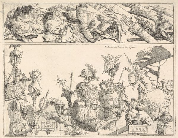 Editor: So, this engraving is called "Surrealistische voorstelling," which translates to "Surrealist Representation." It was created in 1965 by Fabius von Gugel. There is just so much to see! It feels almost overwhelming at first glance... like a dream, maybe? How do you even begin to unpack something like this? Curator: Overwhelming is right! I feel like I've tumbled into a bizarre encyclopedia. This artist has woven a tapestry of symbols and… let’s call them eccentricities. I am seeing a commentary, or perhaps a lament, on the weight of knowledge, on the bizarre machinery of progress... notice all the references to classical philosophy amidst industrial gears and allegorical figures? It feels like von Gugel is posing a question: what are we doing with all of this knowledge? Editor: Yes, I see that now! Like, we’re cramming all this information in, but for what purpose? All these books and writings scattered around… it's almost mocking. Are there particular symbols or visual objects that stand out to you? Curator: For me, it is that interplay between the geometrical, clean lines of modernity colliding with classical allegories, such as in the figure with books near the sun. To me, they evoke that transition from Enlightenment to Modernity. Like two puzzle pieces that just barely fit. What do you think? Editor: I get that. It’s like two different worlds clashing and coexisting. And all that line work creates so much texture and depth! Curator: Absolutely! What was most interesting, for me, was the interplay between linear precision, versus the surreal imagery, which brings me to the deeper point that the artist is speaking to, but through that precise medium, perhaps trying to create some stability out of the messiness. How’s that land with you? Editor: That really makes sense, using the engraving to find clarity and stability amidst the madness! I initially just saw chaos, but now I’m starting to appreciate this piece for the complexity and intention that has been put in to the details. Curator: I find in those initial impressions often lie the greatest treasures, if we just grant ourselves the permission to pause long enough. What a trip!