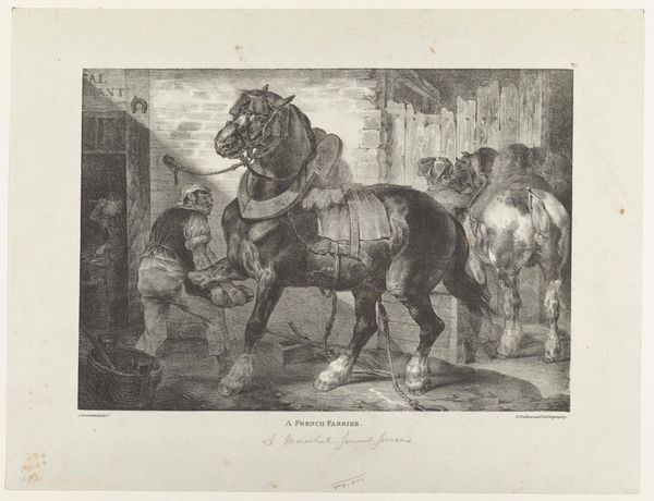 Curator: Let’s turn our attention to "Wagenmenner leidt een tweespan dat een zwaar beladen kar trekt," or, "Wagon Driver Leads a Team of Two Horses Pulling a Heavily Loaded Cart," created in 1883 by Léon Brunin. Editor: The scene has an air of relentless effort; it’s rough. I can almost feel the strain in the muscles of both the horses and the driver through the density of line. Curator: Absolutely, Brunin encapsulates the daily toil inherent in late 19th-century labor through a rather unvarnished lens, nodding to the social realism gaining prominence then. Note how the figures, especially the horses, dominate the landscape. Editor: It's fascinating to see etching employed this way. Often, etching lends itself to finer detail, but here, Brunin harnesses it to showcase labor, the sweat and grit, reminding me of the physicality of the medium mirroring the theme. Curator: It’s interesting you mention the physical labor because the rise of industrial printmaking allowed images like this to circulate widely, shaping public perceptions of rural work and even influencing debates about labor reform at the time. Consider also, how Brunin depicts this particular form of animal exploitation. Editor: Definitely; this makes me consider the economics of printmaking at the time and its availability to various social classes. What sort of societal impact did it have to see images like this become popularized via mass production? Curator: Such prints brought scenes of labor and working-class life into the homes of the middle classes, potentially sparking a sense of social awareness or perhaps even aesthetic appreciation for the "authentic" lives of others, of course depending on the beholder. Editor: I see Brunin made interesting material choices—etching and engraving are hardly quick processes; they required meticulous and repetitive actions, so in a way, the method mirrors the arduousness of the scene being depicted. It gives new weight to the imagery, doesn’t it? Curator: Indeed; this approach demonstrates how images, far from being neutral, actively participate in the construction of social meaning and are informed by their historical context. Editor: Reflecting on this work and our conversation, it reinforces how the art object itself can tell such compelling stories about the materials, and indeed, the society of its creation.
