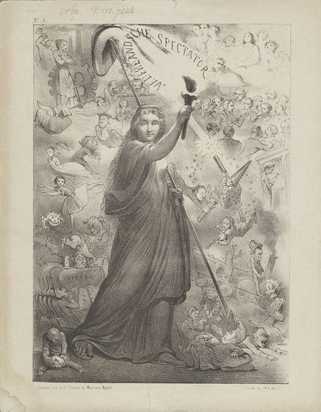 Charles Rochussen created this announcement poster for a ballet using pen lithography. The lithograph captures a scene dominated by a central figure of a wizard looming over a prone man, set against a backdrop of ethereal dancers. Notice how the composition is structured around a clear contrast between the solid, grounded figure of the man and the fluid, dreamlike quality of the figures floating above. Rochussen uses light and shadow to create a sense of depth, drawing the eye upward. The man and wizard might be understood through semiotics: in this context, the wizard symbolizes power and mystery, while the man represents vulnerability and the unknown. The ethereal dancers hint at themes of fantasy, desire, and transformation, typical of ballet. Through a masterful arrangement of form, Rochussen crafts a work that invites us to explore the interplay between reality and imagination, power and submission, thus, the image functions as a window into the cultural fantasies of the time.