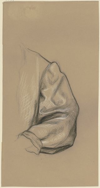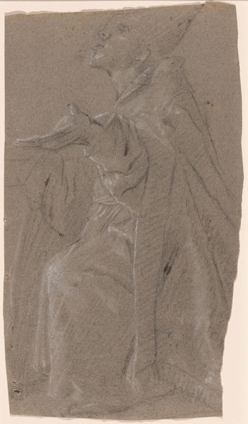 Curator: Here we have Elihu Vedder's "Study for 'The Fates Gathering in the Stars,'" created between 1884 and 1887. Editor: My first impression is one of flowing melancholy. The grey paper and the delicate, almost ghostly, lines create a feeling of something incomplete or fading away. Curator: The Fates, in Greek mythology, were of course the arbiters of destiny. Vedder’s choice to depict them, even in a preliminary study, reflects the anxieties of the late 19th century. It speaks to broader discussions on determinism versus free will during a period defined by rapid social and technological change. The partially sketched form even suggests these turbulent transformations. Editor: Absolutely. The drapery particularly grabs my attention. The way it clings and folds is not just about representing fabric but embodies a sense of constraint and even concealment. I'm struck by the weight given to something that is literally designed to be lightweight. It hints at the burden of fate. Curator: And how might this burden affect women during that period, particularly in Western society, given their lack of agency and pre-defined roles in family life and culture? Editor: Exactly. Perhaps the artist captured the pervasive cultural script that assigned limited possibilities to women, cloaking their own desires in predetermined roles. It brings into question women’s potential when situated in a society built on unequal social and power structures. Curator: We see that throughout Vedder’s ouevre. He continually explored these anxieties within shifting social environments, offering insights on the relationship between personhood and prevailing social conventions. Editor: Vedder’s delicate rendering invites reflection on the power of visual symbols to evoke enduring human experiences. I find it quite timeless. Curator: A piece to contemplate our personal autonomy while being fully aware of the prevailing, shifting conditions surrounding us. Editor: Precisely. Vedder, through his visual language, beckons us to interpret our stories within a shared, inherited one.