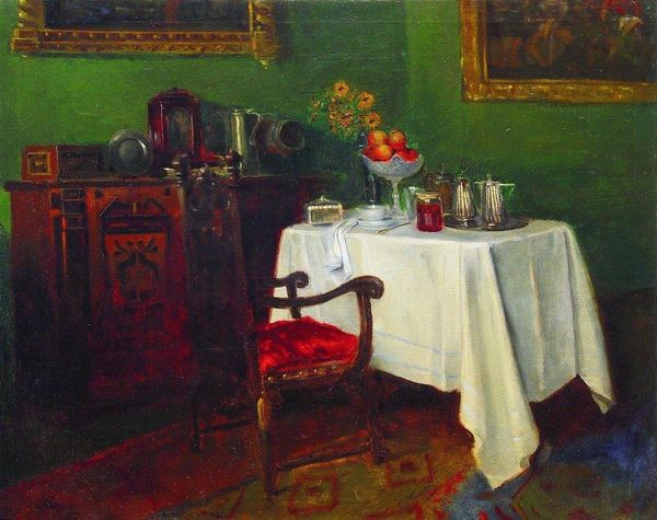 Boris Kustodiev made this painting, ‘In the Room. Winter’, with oil on canvas, and well, it feels like such a domestic scene. There’s something about the way he lays down the paint, kinda thin and washy, that makes the whole image feel light and airy, almost like a watercolor. The color palette, a mix of soft greens, yellows, and blues, adds to this sense of calm and quiet. It's like you can feel the cold seeping in from outside, but the warmth of the room keeps it at bay. Look at the wall behind the woman arranging flowers, and how the vertical stripes are broken up by these loose, sketchy strokes. It's like he's not trying to create a perfect illusion of reality, but rather capture the feeling of light and texture in the room. Which in turn makes me think of Vuillard, both these artists have this way of collapsing the space between the figures and the room, creating a sense of intimacy. It is this blending of the real and the unreal that makes art so damn interesting, don’t you think?