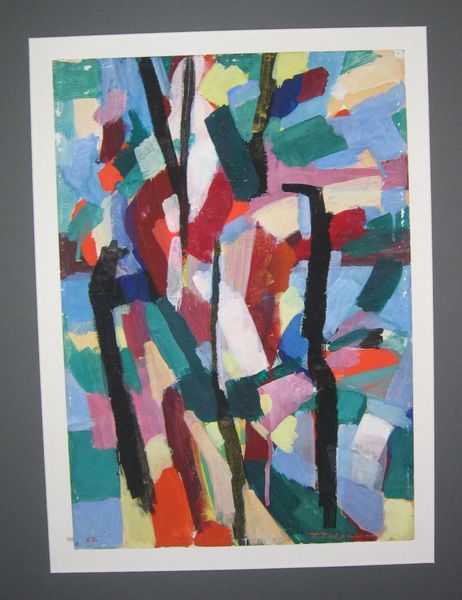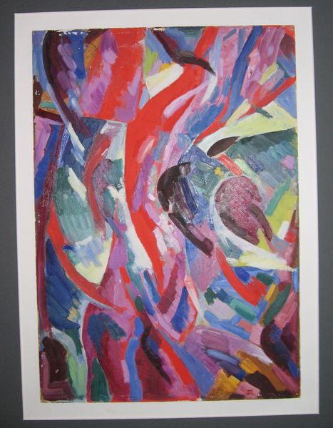Hryhorii Havrylenko created *Composition (With Two Red Spheres)* using oil paint, a readily available material, applied with brushes to create a vibrant abstract image. The thick brushstrokes of blues, yellows, greens, and purples give the painting a sense of energy and movement. The two red spheres punctuate the composition, drawing the eye and providing a focal point amidst the lively chaos. The paint's texture is visible, each stroke bearing witness to the artist's hand. The painting embodies a material optimism through the celebration of color and form. Havrylenko's engagement with painting as a medium, particularly his attention to brushwork, places him within a lineage of artists exploring the expressive potential of paint. The artwork serves as a reminder of the ways in which materiality and making intersect with social and cultural meanings. It challenges traditional distinctions between fine art and craft, celebrating the tactile and sensory qualities of the painted surface.