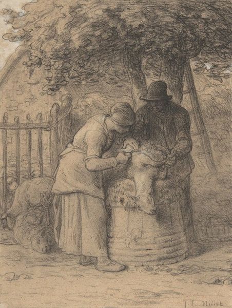Editor: This drawing, "Vrouw met klein kind staat bij zittende oude man voor arbeiderswoning," dating from 1855-1892 by Bernardus Johannes Blommers, is rendered in pencil. It’s quite affecting, depicting what looks like a scene of domesticity and poverty. What do you see when you look at this work? Curator: I see the labor implied in every line. Note the starkness of the pencil, its inherent cheapness compared to oils, reflecting the subjects' likely economic status. The medium itself speaks to a world of limited resources. How does Blommers’ choice to use drawing influence the artwork's social meaning for you? Editor: I suppose it makes the scene more immediate and less idealized than if it were a painting. The rawness is almost journalistic. The dwelling also appears rather temporary, doesn't it? Curator: Precisely. This pencil wasn't created in a vacuum; it’s a product of industrialization, accessible to more artists who want to depict these scenes. We should ask how its availability democratized artmaking, shifting focus toward everyday labor and the plight of the working class, which Blommers depicts with notable social awareness. Consider the labor of the artist as well, making choices about which materials will portray the social setting of the laboring family. What effect does this focus have? Editor: It really grounds the image. Knowing the artist likely considered the implications of his chosen materials provides another layer to interpreting this scene. It feels much more intentional. Curator: Exactly. It challenges any sentimental reading of the scene. The very means of production of the artwork highlights social inequalities, making it a powerful, albeit understated, statement. It brings an immediacy, and a critical eye towards artistic intention. Editor: I see that now. I’ll never look at a "simple" drawing the same way again. Curator: Wonderful! The materials can indeed reshape how we perceive a work, shifting our gaze from subject to the very infrastructure that holds the image.