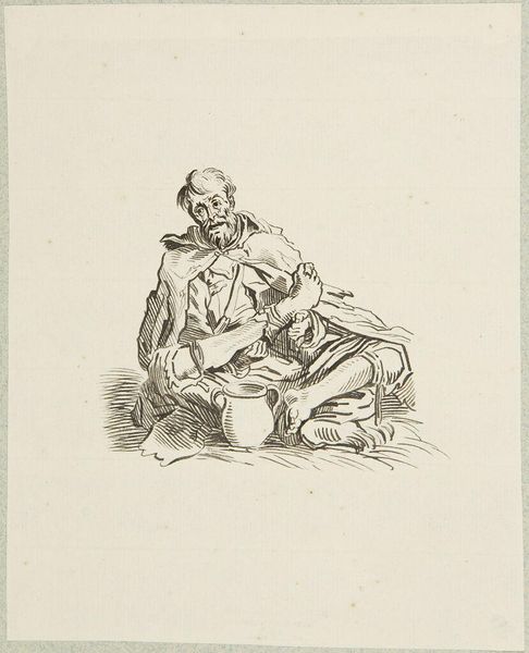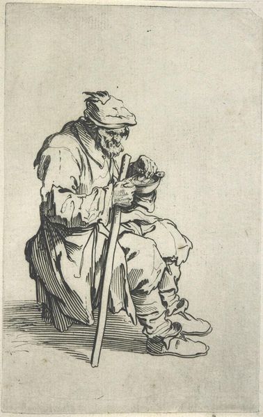 Editor: This is Adrian Ludwig Richter's "Beggar Sitting and Eating, after Callot." It's a detailed drawing, but what strikes me is the figure's posture and the stark use of line to create texture. What do you see in this piece formally? Curator: Indeed. Observe how Richter utilizes hatching and cross-hatching to delineate form and shadow. The density of these marks creates a visual weight, anchoring the figure. Consider the directional lines; how do they contribute to the overall composition? Editor: They seem to emphasize the beggar's hunched position and his focus on the food. Is it that simple? Curator: Not quite, but a good start. Note also the interplay between positive and negative space. The figure is isolated, drawing attention to the lines and their relationship to the surrounding void. How might this isolation inform our understanding of the work? Editor: I hadn't considered the negative space so actively before. Thanks for pointing that out. Curator: Precisely. By analyzing such elements, we gain a deeper understanding.