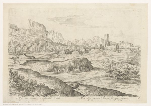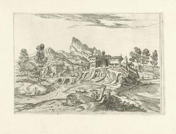 Editor: Here we have "Landscape with Settlement and a Shepherd," an engraving from around the 17th century by an anonymous artist, housed here at the Rijksmuseum. I’m immediately drawn to the stark contrast between the intricate details of the village and the almost desolate, yet serene landscape. What strikes you most about this print? Curator: You know, when I look at this, I feel as though I’ve stumbled into a forgotten corner of someone's memory. The anonymous artist, a ghost in time, invites us to piece together stories suggested by those crisp lines. I see a dance between the ephemeral nature of a fleeting moment, and a yearning for some permanence expressed through the stone architecture that seems to grow out of the landscape. What do you think those geometric structures, almost stubbornly there, tell us about that time? Editor: That’s a beautiful way to put it. They feel aspirational, right? As if people were trying to create a sense of order and permanence. Perhaps against the backdrop of turbulent times? Curator: Exactly! And doesn't the shepherd resting with his dog hint at an idyllic, perhaps imagined, past? A life interwoven with nature, but viewed through a lens of academic art and pastoral yearning. There is so much detail in these kinds of scenes, inviting us to create our own stories as if sitting around a medieval campfire. Is there any particular element that triggers your narrative impulse? Editor: I love how the distant mountains seem to cradle the settlement, offering both protection and a sense of limitlessness, as if the community exists in its own little world. I guess the artist captures both the safety and constraints of life in the village. Curator: Ah, I completely agree. We often want both, don’t we? This simple engraving is such an exercise in contradictions and juxtapositions. Editor: Well, it definitely offers a rich visual world to explore, even with such limited shading and monochromatic imagery. I see something new each time I examine it! Curator: As do I, and that's precisely the magic of this anonymous, 17th-century artist.