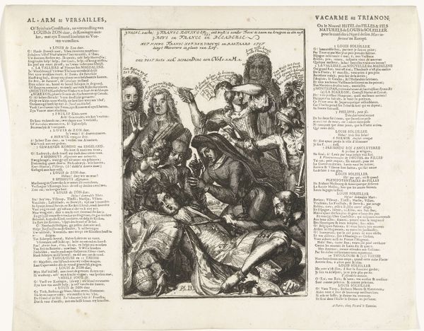 This print, made in 1742 by an anonymous artist, presents a chaotic scene rendered with precise lines and stark contrasts, characteristic of the period. The composition is immediately striking: figures sprawl across the space, surrounding a central female figure who seems to be collapsing. The artist uses the formal device of disarray to communicate disorder. Note how the sharp lines defining each figure and object contribute to a sense of fractured reality. This is not merely a depiction of a scene, but a structured commentary on the attempted robbery of Austria. The semiotic interplay here is fascinating. The central woman is a signifier for Austria. The disorder around her, meticulously rendered, points to the broader political and social turbulence of the time. The careful rendering of chaos challenges fixed notions of stability and power through its visual structure. This print functions as a potent form of visual rhetoric, where form and content are inextricably linked.