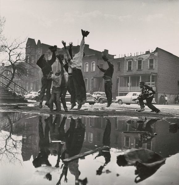 Curator: I'm immediately drawn to the contrast—the desolation punctuated by the small flame, a fragile symbol of hope against the monochrome landscape. Editor: Yes, it’s a stark image. This gelatin silver print, simply titled "Untitled", was captured in 1977 by Markéta Luskačová. Curator: There's a biblical resonance to it, wouldn't you say? The huddled figures, the falling snow… It recalls images of hardship, of refugees, perhaps even the Nativity rendered in an urban wasteland. The fire almost acts like the star. Editor: I agree that this piece evokes empathy, reflecting Luskačová’s commitment to documenting marginalized communities in the face of socioeconomic realities. You see these men struggling against an uncaring system. They look cold, destitute, and alone despite being huddled together for warmth. The location suggests urban decay—fences, exposed ground—signs of a city failing its inhabitants. Curator: Absolutely. And look how she frames the composition. The falling snow isn't just weather; it's a veil, blurring the lines between reality and something… other. Editor: The figures are visually weighted down by the falling snow, suggesting feelings of depression and being burdened by circumstance, almost trapped in time. Curator: Precisely! Even the buildings in the background seem to loom like silent, indifferent giants. Editor: Well, Luskačová consistently challenged notions of documentary photography as purely objective. There's a subjective experience represented, even if not literally portraying her inner world. She gives these discarded people a place in history. Curator: It’s a deeply human scene, filled with potent symbols of perseverance against the odds, even though they might seem small, almost invisible to those "giants" in the background. Editor: This photograph reminds me that there is profound dignity in capturing life as it is actually lived, and it shows a community where even basic needs are challenged. Curator: For me, this photograph asks us to see beauty and spiritual significance even in the most unlikely places, amidst what seems lost or broken. Editor: It demands action, not just observation.