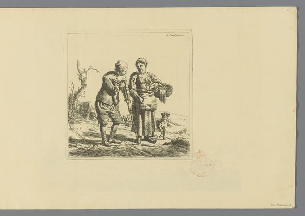 Editor: This print, "Two Riders and Commander in Seventeenth Century Clothing", was made in 1857 by an anonymous artist. It’s currently held at the Rijksmuseum. The meticulous lines and shading of the figures, especially the armor, caught my eye. It seems to present a very staged or constructed depiction of history. How do you interpret this work through its visual elements? Curator: What strikes me first is the stark composition itself. Notice how the artist uses line and form to separate the three figures, almost creating distinct vignettes within the same frame. The use of light pencil work, as the metadata suggests, emphasizes contour over volume, contributing to a flatter, more graphic representation of depth. Do you see how this flatness affects your understanding of the work? Editor: I do. It feels less about depicting a real event and more about displaying archetypes or figures from the past, like illustrations in a history book. There’s almost a detachment, enhanced by the crispness of the lines and the controlled shading. It highlights their costumes more than their personalities. Curator: Precisely. This controlled execution underscores a preoccupation with representation over realism, echoing concerns in academic art. Consider the placement of each figure, their posture, the textures of their garments, how it seems intended to catalog these details as opposed to drawing us into a narrative. Is there anything more these purely formal elements may suggest? Editor: Perhaps the rigidity suggests an idealized or sanitized view of history, removing the chaos and uncertainty for a cleaner, more digestible image? Curator: An astute observation. The work uses historical figures not for the sake of historical record, but as tools for an aesthetic exercise that emphasizes visual structure and precise formal arrangements. Editor: It’s fascinating to see how a seemingly straightforward image can reveal so much about the artist's intentions and the art's theoretical framework. Curator: Indeed, focusing on the intrinsic qualities opens avenues for deeper understanding and allows us to move past surface impressions and grasp its core meaning.