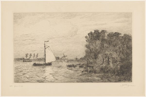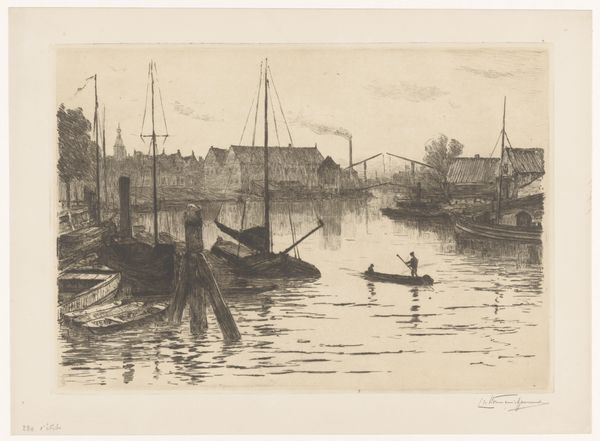 Editor: Here we have "Harbor View with City Hall in Vlissingen," an etching by Carel Nicolaas Storm van 's-Gravesande, made sometime between 1887 and 1902. It feels somber, almost bleak, in its depiction of this Dutch port city. What strikes you when you look at this piece? Curator: The etching technique itself contributes to that mood. Look at how the fine lines create a sense of depth, but also a certain ambiguity. Consider, too, the weight of the symbolism inherent in a harbor. Ports represent transitions, departures, and returns. What cultural memory do you think it evokes? Editor: I suppose a lot of the feeling comes from the way he portrays the sky - so heavy with clouds. And there's something about the contrast between the solid buildings and the implied movement of the water. Curator: Indeed. The sky speaks volumes, doesn't it? It could symbolize a restless, uncertain future. And what of the vessels themselves? Ships are more than just modes of transport; they're powerful emblems of exploration, commerce, and even conflict. Do you think that is conveyed? Editor: It's there, subtly. The ships almost look tired. And it’s interesting you mention that this etching technique seems ambiguous: the city buildings and their reflection are also quite faded as well. It doesn't seem to reflect optimism and confidence. Curator: Perhaps the artist intended to express the passage of time and inevitable change to maritime activities through a realistic but nuanced portrait. Storm van 's-Gravesande lets us explore this harbor not just as a place, but as a repository of cultural history and the human condition. Editor: I now appreciate that there are different ways of interpreting it and what is conveyed through a specific technique and imagery. Curator: Absolutely, and by looking at art from different angles, and with a sensitivity towards the artist’s context, it will provide invaluable insights.
