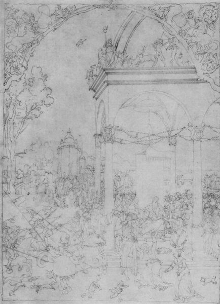 Editor: So, this is a drawing called "Annunciation," attributed to Albrecht Durer. It looks like ink on paper, maybe. What strikes me is the architecture; it’s so intricate, almost like a stage set. How should we interpret it? Curator: It's fascinating how Durer uses the architectural space to frame a pivotal religious moment, isn’t it? Consider how this image might have functioned within the social and religious landscape of the time. The Annunciation was a common subject. What's different here? Editor: Well, the setting feels almost domestic, less overtly religious than some depictions. Curator: Exactly. Think about the rising merchant class in Northern Europe during the Renaissance. This more intimate portrayal of the Annunciation arguably reflects a shift in religious practice. How might ordinary people have viewed the Virgin Mary through this lens? Editor: As more relatable, maybe? Less divine, more human. It changes how one might approach her, or religious imagery in general. Curator: Precisely! The drawing becomes less about unreachable divinity, more about understanding faith within the domestic sphere. Also, consider how printmaking democratized art during the Renaissance. Images like these became accessible to wider audiences. What impact might this have had on religious belief and practice? Editor: I see what you mean. Mass production shifted how individuals experience religious narratives, not just through grand church paintings but through smaller, personal images. Curator: Absolutely! Durer’s "Annunciation" becomes a tool to comprehend societal changes in religion and visual culture of his time. It represents an intimacy to be explored at an individual's pace. Editor: I never considered that the artwork served as a form of early social commentary. This has definitely deepened my appreciation of it. Curator: It's wonderful how historical context can illuminate familiar images with such striking nuance.