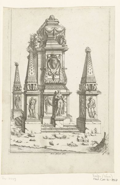 Jan Goeree created this print depicting the Temple of Peace in 1721. It commemorates the end of the Great Northern War. Amsterdam, a center of trade and diplomacy, celebrated the peace with elaborate festivities, including fireworks displayed from this temporary structure. This print is more than a record of a celebration, it's a window into the complex interplay of power, religion, and commerce in the 18th century. The Temple, adorned with classical figures and symbols, reflects the desire to align the Dutch Republic with the grandeur of past empires. Yet, the ephemeral nature of the fireworks reminds us of the fleeting nature of peace and prosperity. Consider the layers of meaning embedded in this image: the celebration of peace juxtaposed with the implied violence of war, the display of wealth and power against the backdrop of a city built on trade, and the use of classical imagery to legitimize a distinctly modern political order. What does it mean to build a temple to peace, only to have it consumed by fire?