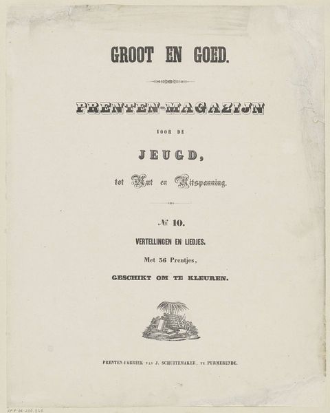 Jan Schuitemaker made this book cover – Prenten-magazijn voor de Jeugd – as part of a series intended, as the title suggests, to be a picture magazine for young people. The magazine, printed in the Netherlands, was designed for ‘nut en uitspanning’ – use and recreation. It combined the popular pastimes of reading and singing. Most strikingly, it was suitable for colouring. The reference here to ‘youth’ is telling: with the rise of industrial capitalism in the nineteenth century, the category of childhood became a subject of increasing social and institutional focus. The cover uses visual codes that combine decoration with child-like playfulness. The lettering suggests the bold forms of a circus poster, while the symmetrical border creates an impression of formal elegance. To understand the role of this artwork, it is important to consider the growing importance of education and leisure in the Netherlands at this time. Social historians have shown the part such magazines played in shaping values and behaviours, and how they reflected changing ideas about the status of childhood.