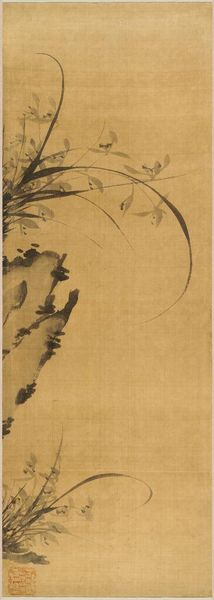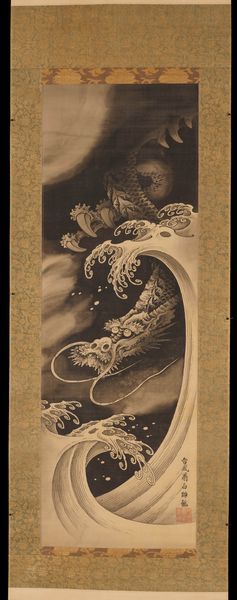 Editor: This is "Grape Vines in the Wind," an ink-on-paper hanging scroll attributed to Tenryū Dōjin, created around the late 18th century. The cascading vines give it such a fluid and almost frenetic energy. How would you interpret this piece in its historical context? Curator: This work exemplifies the *ukiyo-e* tradition in Japan. It isn't just about depicting nature; it's about capturing a feeling, a fleeting moment. Think about the socio-political climate of late 18th-century Japan: a rigid social structure, but also a burgeoning merchant class with disposable income driving the demand for art like this. The wind, rendered so dynamically, could symbolize change, a stirring within that societal structure. Does the upward movement contrast with your interpretation of its frenetic energy? Editor: I see what you mean. The upward movement contrasts nicely with that late 18th-century Japan context you described. So it's like a hidden subversiveness then? Curator: Subversiveness might be too strong a word, but certainly a gentle questioning of the established order. It invites the viewer to consider the power and beauty of nature. And note the absence of human figures. In *ukiyo-e*, nature often acts as a mirror to society, reflecting its anxieties and aspirations. What’s more subversive than centering everything around nature? Editor: That's such a different way to look at landscape art. I'd never considered the "absences" in a piece speaking so loudly. Curator: It challenges our preconceived notions about who and what has the power to narrate history, doesn't it? Even a simple image of grape vines swaying in the wind can become a profound commentary on its time. Editor: I definitely have a deeper appreciation for *ukiyo-e* now, understanding the potential for socio-political commentary in this genre.
