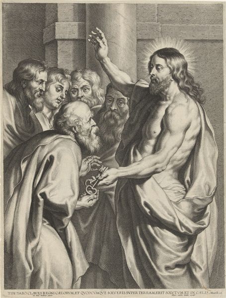 Antoine Alexandre Joseph Cardon created this print, "Christus geeft Petrus de sleutels," sometime before his death in 1822. The image depicts Christ handing the keys to Heaven to Saint Peter, a symbolic gesture of power and succession. Consider the historical context: Cardon worked during a time of significant social upheaval, including the French Revolution. Religious institutions were powerful, yet increasingly questioned. In terms of identity, this print reinforces the Catholic Church's authority, portraying Peter as the divinely appointed leader. Yet, it also invites reflection on the nature of power itself. Who gets to decide who holds the keys? What does it mean to be granted such authority? This image may evoke feelings of reverence, but I encourage you to also consider the political implications of such a depiction. Does it challenge or uphold existing power structures? How might it have been viewed by those who felt excluded or marginalized by the Church?