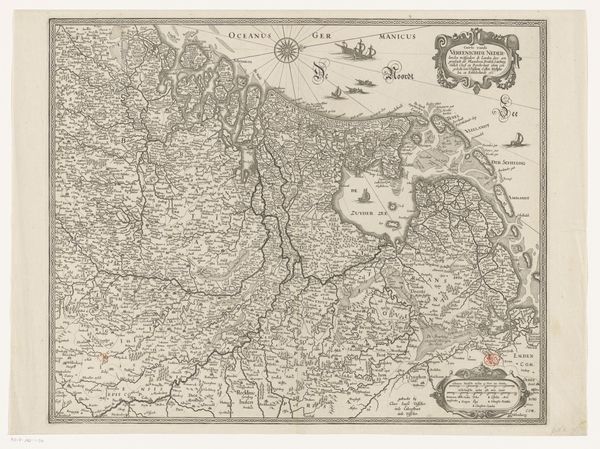 This map of the Netherlands in Roman times was rendered in ink on paper by an anonymous maker. The lines you see, describing the geography, would have been etched into a metal plate, which then transferred ink to paper. The character of these lines gives the work a sense of precision. In fact, though, maps are never entirely accurate, they reflect the political agendas of their makers, and how they understood the relationship between land and power. Consider also the labor involved in the production of this map: from the papermaker, to the one who mined the metal for the printing plate, to the person who set the type, to the hand that cranked the printing press. All this work went into disseminating a particular view of the world. When we look at a map like this, we're not just seeing geography; we're seeing the result of many people’s work, all bound up with issues of knowledge and control. It is a kind of collaborative, historical performance.