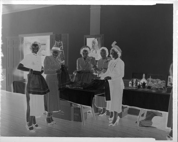 Editor: Here we have an untitled photograph by Martin Schweig, depicting a woman chatting with four people in chairs at a New Year's party. The photographic inversion lends a ghostly quality to the scene. What do you see in its composition? Curator: The photograph utilizes a strong foreground, anchoring the composition. Note the deliberate arrangement of figures and their attire, creating a rhythm of dark and light. The interplay of textures and shapes contributes to the overall formal complexity. Editor: It seems as though the inversion reveals a hidden structure. Curator: Precisely. The inverted tonality allows us to perceive the formal elements with heightened clarity, divorcing them from conventional interpretations. The stark contrast emphasizes the underlying geometry of the composition. Editor: That’s a completely different perspective than I initially had. Curator: Considering art through its visual components really opens it up.