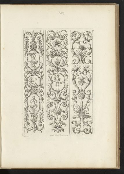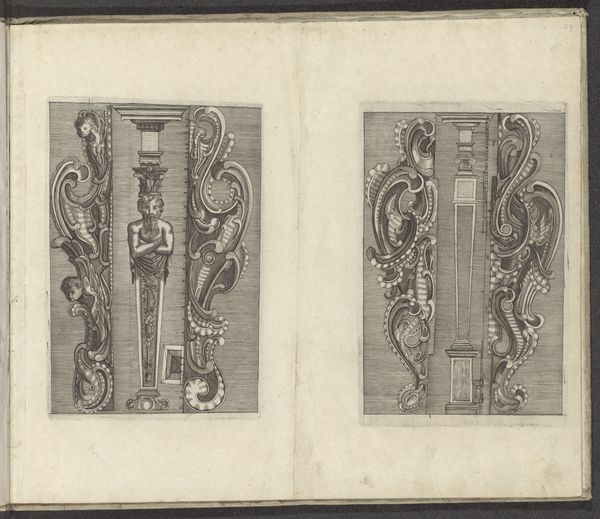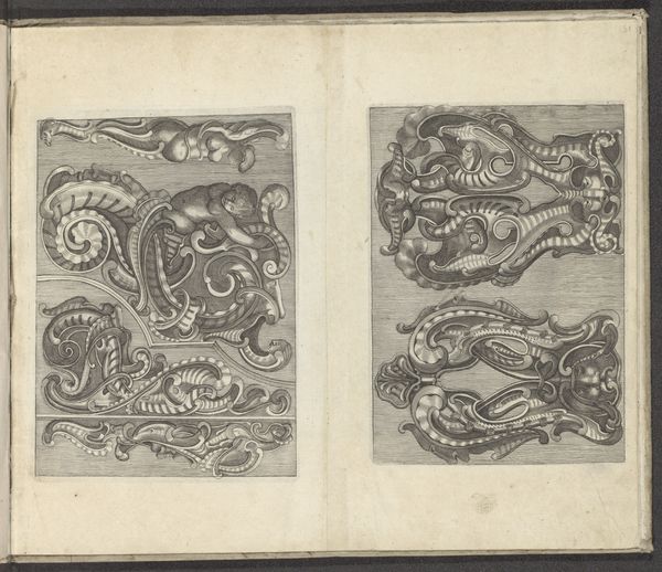 These paired images, titled "Vier ornamenten in kwabstijl," present a study in the baroque possibilities of form. Executed by an anonymous artist, these prints showcase the 'kwabstijl,' or auricular style, characterized by fluid, organic shapes. Observe how the artist uses line and form to create a dynamic sense of movement. The shapes undulate and interlock, suggestive of cartilage or sea creatures. The intricate details, rendered with delicate lines, invite close inspection, while the contrast between the solid forms and the empty spaces creates a visual rhythm. Notice how the interplay of positive and negative space challenges our perception. Are these forms emerging or dissolving? This ambiguity destabilizes traditional notions of form and function. The lack of clear boundaries blurs the distinction between the object and its surroundings. It suggests a world in constant flux. Ultimately, these prints invite us to question the nature of form. How do we define boundaries? How do we perceive the relationship between the solid and the void? These questions remain relevant, encouraging us to engage with art as a space for ongoing inquiry and interpretation.