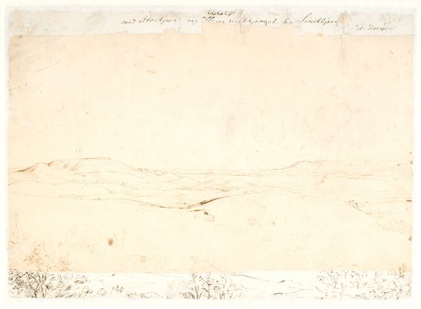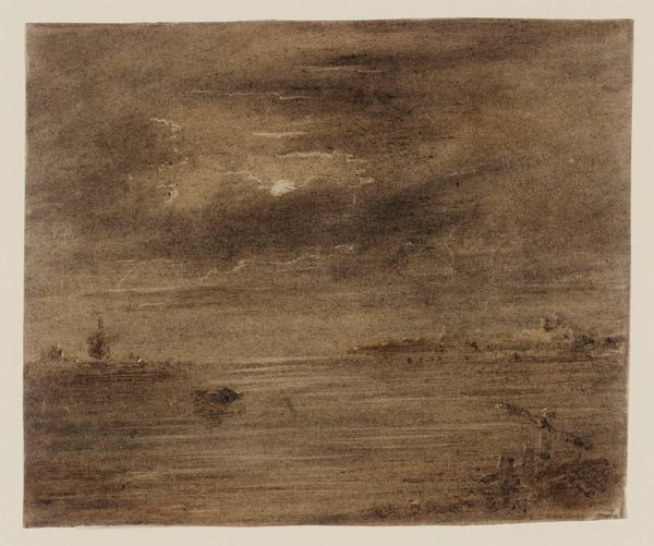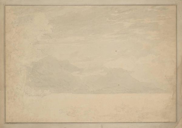 Curator: Let's turn our attention to Albrecht Anker’s “Regnerischer Himmel über einer Seelandschaft,” or “Rainy Sky Over a Seascape,” created in 1892, using watercolor and mixed media. Editor: It evokes a particular mood. The overwhelming grey is incredibly effective at setting a tone—one of stillness and perhaps a touch of melancholy. There is very little chromatic contrast. Curator: Water as a mirror, the sky bearing down—both symbols resonant with the psychological weight of introspection, don’t you think? This image taps into that very human feeling of being small under a vast, perhaps indifferent, universe. Editor: From a formalist perspective, the blurring of the horizon line certainly emphasizes the atmospheric perspective, lending itself to that feeling. The way the wash is applied gives an incredible texture, particularly in the sky. Do you see the small patches of untouched paper? Curator: Yes, and they become like tiny points of light trying to break through. For viewers of Anker's time, used to idealized landscapes, this would have read as a bold statement—an honest portrayal of a common, if less picturesque, scene. The lack of distinct forms emphasizes the mutability and ephemeral quality of the atmosphere, symbolizing, perhaps, the transient nature of life itself. Editor: It’s also interesting how he divides the pictorial plane, stratifying land, water, and sky in nearly equal measure. The line of text in the upper-left seems at odds. A compositional element added post-hoc, maybe? The texture becomes quite active around that area. Curator: Perhaps, a quick note or label added during its creation as it might reflect the immediate perception of the moment or to register how the scenery felt for the artist, capturing not just a view but a lived experience. We may never know its origin with certainty. Editor: Despite its simplicity, it holds a significant level of complexity when one dissects the interplay between texture, colour, and form. Thank you for highlighting the cultural context for this. Curator: And thank you for adding an elemental voice to our own subjective analysis of visual experience, highlighting a variety of elements to reveal deeper symbolic interpretation!