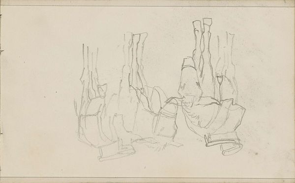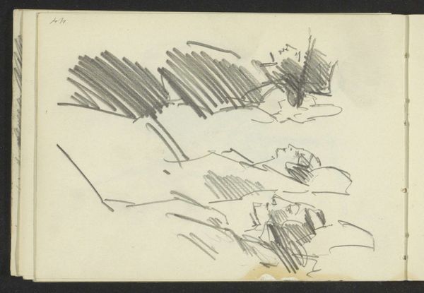 Curator: This drawing, titled "Ship's Stern Island, Maine," comes to us from John Marin, and was completed in 1951. Editor: It has a rather skeletal feeling. The minimal linework evokes bare bones. Almost a primal sketch of an island’s essence. Curator: Indeed. Marin's work often presents the raw energy of nature, doesn't it? Maine held deep significance for him as a source of inspiration. The motif of an island bears a rich legacy as a powerful archetype. Do you think it offers some perspective on ideas about separation? Editor: Absolutely. Look at the paper itself: a page torn from a sketchbook, held together by its spiral binding, grounding the entire piece within a specific context of artistic labor. Curator: That material reality becomes a visual prompt to consider the social and emotional terrain embedded in an image. It feels provisional. Editor: The pencil or ink lines are so spare, like he's stripping away everything inessential. No fancy papers or painstaking studio process here, just raw observation converted to form. Curator: There’s almost a sense of immediacy, as if he’s capturing not just the island but the fleeting feeling of it. It captures something intrinsic, even inevitable, about humanity's relationship with geographic formations. What lies beneath our desire to demarcate these shapes? Editor: What interests me is how that feeling is caught. There's no heavy blending of pencils, rather a straightforward, immediate impression. Labor over medium gives us more access to what must've struck him about the Stern Island. Curator: The lack of polish emphasizes the honesty of vision, almost inviting us into his thought process. Perhaps this drawing hints at cycles of birth and decay. Maine certainly holds that meaning within an American psyche, given how early it was settled, industrialized, abandoned, and reinvented through tourism. Editor: Right, we're witnessing a moment in the hand-to-eye coordination, translating geographical location into representation of location, all within this sketch book context. Curator: Well, considering Marin's legacy, this piece feels more than a simple sketch. It stands as an icon itself—pointing back towards nature while bearing witness to the power inherent in artistic creation. Editor: Exactly, and as such the bareness of this visual statement strikes a sharp contrast between labor, tools, and the weight it yields as a sketch in fine art today.