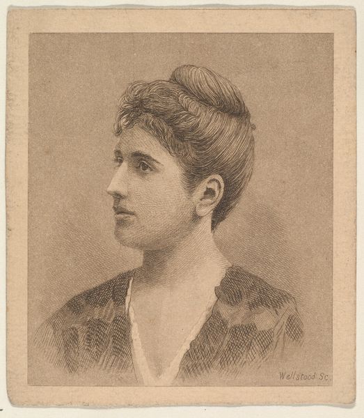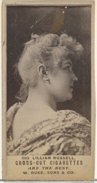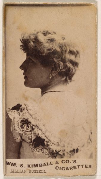 This is "Actress from the Old Judge series (N167)" a lithograph card, made by Goodwin & Company in the late 19th century. The sepia tones and the actress's profile immediately evoke a sense of nostalgia, drawing us back to the era of early mass media and celebrity culture. The composition is strikingly simple, with the actress’s head and shoulders dominating the frame. Her refined profile, framed by the soft curls of her hair and delicate frills of her dress, suggests an emphasis on beauty and elegance that was valued at the time. The use of sepia tones softens the image, creating a sense of intimacy. Produced as a promotional item for Old Judge Cigarettes, the card is a sign within a complex network of cultural codes. While it is a commercial object, it is also a signifier of emerging ideas of celebrity, beauty, and consumer culture. The actress, carefully posed and presented, becomes a commodity, her image used to sell a product.
