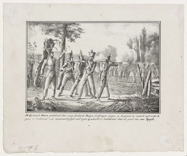 Curator: This is Pieter Tanjé’s engraving, "Willem III gehuldigd als heer van Friesland, 1328," created between 1748 and 1750. It’s currently held at the Rijksmuseum. Editor: It has the feel of meticulously crafted theatre. The tonal range created by the engraving process evokes a real sense of depth in what would otherwise be a quite formal arrangement of figures. Curator: Tanjé really captures a historical moment laden with political weight. Look at Willem III elevated above the crowd, a literal embodiment of power via those doing the physical labor to raise him. The surrounding figures express submission or cautious celebration; an immediate relationship is made between labor, material, and sovereignty. Editor: Yes, and I see it fitting into the broader scope of Dutch history painting, deployed to reinforce specific narratives about national identity and leadership. That bowing figure highlights that deference. How was Tanjé, in the mid-18th century, using this moment from the 14th century? Curator: Indeed. This wasn't just a neutral record; the very act of memorializing Willem III in this manner shaped the reception of his authority for the consumption of Tanjé's public. It almost functions like a piece of political marketing. But let's appreciate how much work must have gone into preparing the copperplate itself, especially considering the fine details Tanjé rendered using the engraver’s burin. Editor: True, Tanjé would have had an interesting working life, commissioned to produce and reproduce imagery within specific visual frameworks. I agree with you that, by focusing on the image’s production, the social function of images also become evident; an explicit link to power, really. Curator: The relationship is very visible here. And ultimately, a lot of skilled labor underpins our art history and cultural assumptions today. Editor: I'll remember Tanjé now! A cog in a bigger symbolic machine but nonetheless contributing to a wider political picture.