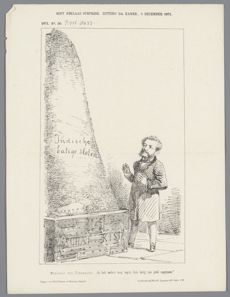 Curator: So, this drawing is titled "Spotprent op de Roomse kerk, naar aanleiding van de Aprilbeweging, 1853", dating back to 1853, of course. It is held at the Rijksmuseum. The artist, though, remains anonymous. Editor: Hmm, a man poking at two large, engraved stones with a stick—feels a bit like someone confronting stubborn, outdated ideas. There's something quite assertive about the act, but also weary. I can't quite say if he has hope for moving them. Curator: Well, that interpretation isn’t far off. Given the "Aprilbeweging," the drawing serves as a caricature commenting on the Catholic Church, in this case, specifically related to theological education. You can make out some of the names, like ‘Faculteit der Godsdienstwetenschappen’ or, Theology faculty, carved into those stones. Editor: So the rocks are…institutions, or rather, dogma rendered immobile? What fascinates me are the materials. It's a print, presumably mass-produced, putting this critique into wide circulation, into homes, newspapers, public spaces—almost as a commodity itself. Did the people producing those images see the irony of criticizing an establishment with the very tool that was creating mass-communication networks? Curator: The material conditions of its production speak volumes. Its accessibility would amplify its message and reflect popular sentiment toward religious conservatism. Editor: Exactly, it takes something complex—social unease, religious tension, institutional critique—and packages it for mass consumption. The lithographic lines, so clean and repetitive, even echo the inflexible thinking it seems to protest. Curator: You’ve really hit upon the nuance! It captures a society at odds, using emerging media to challenge entrenched powers and social practices. One man, it appears, hopes to topple an empire of thought. Editor: In the end, it is all the more fitting, since this object itself is now an archive of a brief window in time, one that tells of ideological struggles, social movements, artistic ingenuity. An artist and a country both finding a new path. Curator: And hopefully this conversation encourages everyone to dig a little deeper.