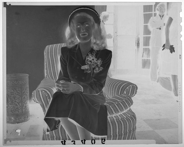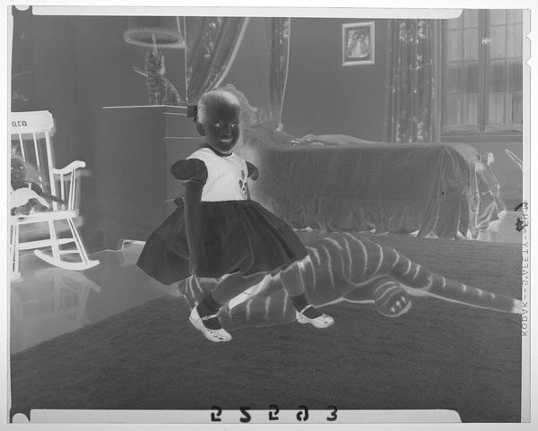 Editor: This photograph, by Martin Schweig, shows a girl and her stuffed tiger. The image feels intimate, like a peek into a private world. What’s your take on it? Curator: I notice the image is a negative. This immediately positions the work within the historical context of photography's evolution. It's not just a picture of a child; it prompts us to consider the photographic process itself, and its place in shaping our understanding of "truth" and representation. How does the negative alter your perception? Editor: It makes it feel a bit ghostly, more like a memory than reality. Curator: Precisely. And what role do you think that plays in the public consumption of imagery? Editor: It is more thought-provoking than a regular photograph. I see now how the negative affects the image.