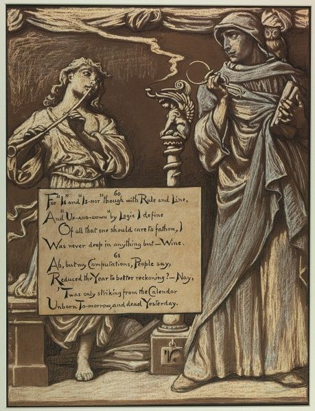 This is Elihu Vedder's "Omar's Horoscope," a work made with watercolor and graphite. Vedder uses the flat quality of these materials to emphasize the symbolic content of the work. Notice the swirling figures at the top, contrasting with the text block in the middle. Vedder surrounds this with a border of illustrative elements. The grapes and vines are recurring themes, alluding to the poem's references to wine and earthly pleasures. The poem is also an important material in this artwork. Vedder renders the stanzas from The Rubaiyat of Omar Khayyam in a calligraphic style. The writing becomes a crafted element. This invites the viewer to consider the relationship between word and image. Each element is carefully constructed, and contributes to the overall meaning of the work. By attending to materials, making, and context, we understand the full meaning of an artwork, which challenges traditional distinctions between fine art and craft.