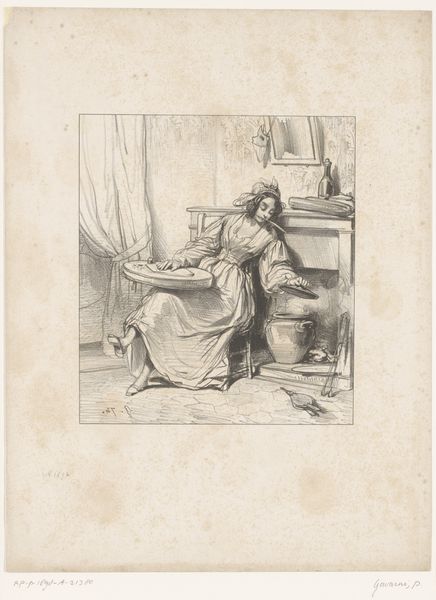 Curator: So, here we have Paul Gavarni's drawing, "Arme oude vrouw op een bouwplaats," created around 1857-1858. It's currently housed here at the Rijksmuseum. What strikes you initially about it? Editor: The texture, definitely the texture. The rawness of the materials surrounding her juxtaposed with what looks like well-worn fabric. It reads to me as resilience crafted from grit, almost literally from the look of it! Curator: Indeed! Gavarni really captures that stark reality, doesn't he? He was a master of line, and it's all pencil here. I almost feel like I can see the artist, quickly sketching, moved by the subject— the energy really pops for what is essentially an evocative sketchbook page. Editor: Right, the immediacy. Look at the rough edges of those building stones – their sheer scale emphasizing the woman's fragility but then, consider what the materials are made of—sedimentary rock formed through layers of organic materials, and now being processed to literally construct social foundations—it creates an inescapable comment. Curator: And I love how that rawness allows her inner world to peek through. There's a tenderness in her upward gaze, a gentle resignation perhaps. The romance of an industrious spirit meeting cruel circumstances—you know? A very powerful comment on the margins of Parisian society in transition. Editor: The setting speaks volumes. Building sites are intrinsically linked to ideas of progress, industry, labor. The raw building materials are a physical reminder of the costs, those pushed to the fringes of societal building and renewal projects—a study of how material circumstances deeply shaped lived realities and human experience. Curator: A poignant reminder that progress always comes at a human cost. Her posture is very striking as well: not defeated, exactly. Just weary and resting. Editor: Ultimately, it reveals how a drawing can reflect broader societal realities, highlighting inequalities embedded within structures that continue to endure today, whether intentionally or unintentionally. Curator: That's Gavarni—a true humanist capturing glimmers of hope amidst hardship. Something in that look of resilience and perhaps defiance that leaves you feeling it will somehow turn out.