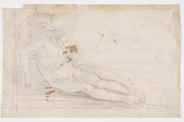 This drawing, “Two Seated Putti,” resides here at the Art Institute of Chicago and presents us with an interesting study in form. Rendered in sanguine, a red chalk, two cherubic figures are delicately sketched against the paper's pale surface. The composition strikes a playful balance; one putto reclines above, limbs akimbo, while the other is seated below, reaching out as if engaging with an unseen world. Look at how the artist uses line and gesture to convey a sense of movement and weightlessness. The sinuous curves and soft shading create a sense of volume, yet the figures remain ethereal, not quite tethered to reality. There’s a clear emphasis on capturing the idealized human form, typical of classical artistic traditions, but the artist’s exploration of dynamic poses moves beyond mere imitation. The arrangement challenges our perception by subtly playing with asymmetry and perspective. This work is an exploration of line, form and space to convey a sense of liveliness and divine playfulness.