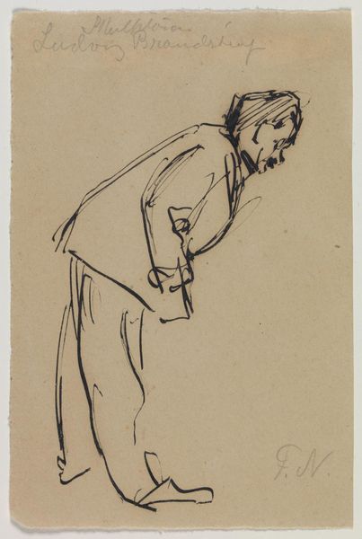 Curator: This pencil drawing, titled "Mansfiguur," dates back to somewhere between 1875 and 1900 and is currently held at the Rijksmuseum. What are your first thoughts on it? Editor: There's something profoundly melancholic about this figure. The subdued grey tones emphasize the sense of his solitude. Curator: Indeed, the limited palette contributes significantly to the drawing's somber mood, but what about the man himself? Do any elements speak to you in terms of symbolic value? Editor: Well, his averted gaze, combined with the posture – hands clasped behind his back – suggests a psychological retreat. The hat, however, could signify some position of authority or status in society. Though perhaps weighed down by it, look at how the artist's materials convey a sort of tension in the subject's posture. Curator: I appreciate you pointing that out. Do you think the artist might be conveying inner turmoil beneath that veneer of authority? Or, more literally, how does the materiality of the paper inform how the artist captures shadow and light? It looks to me that it could easily have been a sketch that became part of a finished larger work. Editor: The texture of the paper probably had a factor into creating texture here and the marks with such a simple tool. It speaks to resourcefulness, making impactful observations within the constraints of limited materials, and of time, to produce a larger work. The medium itself reflects his humble, withdrawn stance. Curator: A thoughtful connection, yes. This image captures more than a simple physical representation of a man. This exploration reflects enduring facets of the human condition across time. Editor: Right, something that prompts contemplation regarding the weight of societal expectations and our inner struggles and this piece captures just that, very profoundly.