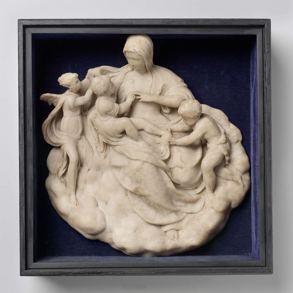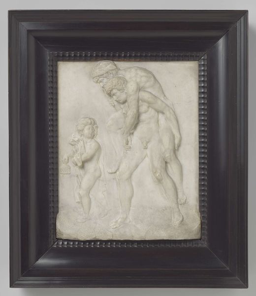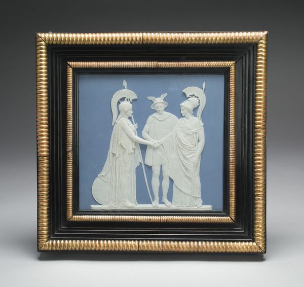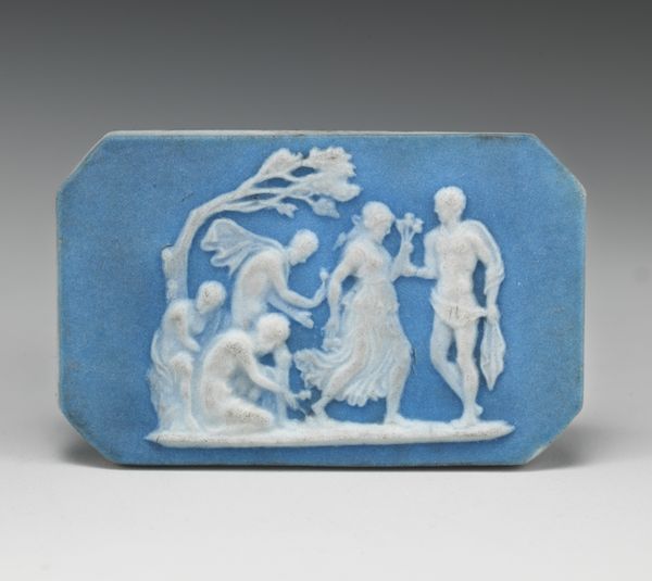 Curator: Isn’t this piece, "Plaque with Bacchantes and Satyr," from around 1800 by the Wedgwood Manufactory, absolutely enchanting? It's currently held at The Art Institute of Chicago, a serene blue ceramic relief. Editor: Enchanting is one word for it! My first thought was actually "tumultuous." All that swirling fabric and those entangled bodies. There's definitely an energy, even captured in ceramic, that speaks of… excess. Curator: Excess in all the right places, darling! The Bacchantes, followers of Bacchus, god of wine and revelry…it embodies that carefree abandonment, a sort of playful rebellion. It feels almost... joyful to watch this mayhem unfold, the artist definitely has something to say on how the other half were partying back then! Editor: It makes me think about how we romanticize the past. While these figures seem joyful, there’s a power dynamic here, too. Satyrs and Bacchantes aren't just about carefree fun; their stories are intertwined with the darker sides of mythology—violence and disrupted social order, which always implicates certain groups of people. Who gets to be carefree and who is vulnerable in those situations? Curator: Oh, I see your point. Looking closer, I suppose the satyr is quite literally weighed down—burdened, even. Perhaps it's not *just* joyous; maybe it's a complex meditation on power and who bears the weight, a gorgeous dance of who's got the control over someone else? It feels timeless that way, like it could be about today! Editor: Exactly! And let’s think about Wedgwood—a brand associated with luxury and refinement. To depict this bacchanal, a scene associated with raw emotion and liberation, on such a delicate and decorative object… there’s a tension there. It’s class performing at once, like they know something everyone else doesn't. It opens to further questions about social and aesthetic values of that time. Curator: I suppose it prompts you to dig below that porcelain surface to those darker truths that society likes to conceal... You always manage to strip away the glamour! Even after our little debate, there's no doubt, that for the romantics at heart this piece brings so much more to unpack as well, I mean, aren’t all of our own complexities the ultimate art piece on show here? Editor: And, hopefully, this plaque, a portal into that intricate understanding between us is something to think about as we wander further today... the things we overlook are there, if you are looking for them.